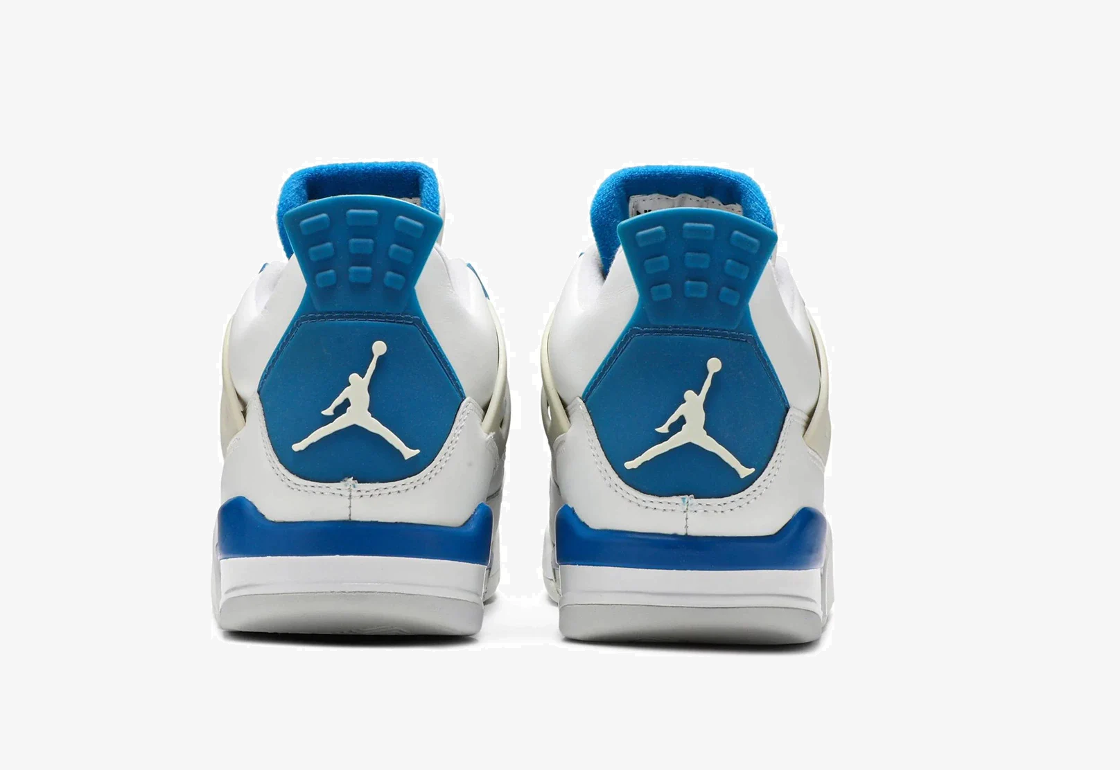 This Air Jordan 4 Retro – Military Blue sneaker features a Jumpman logo on the heel, and the mid-top sports a simple two-tone design. A white leather upper is accented by hits of contrasting Military Blue on the heel, eyelets, quarter panel, and midsole.
