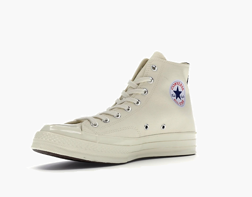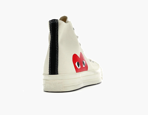 With a look inspired by the Converse Chuck Taylors of the ‘70s, the Converse Chuck Taylor All Star 70s Hi Comme des Garcons PLAY White has a high-top that blends the collab branding and collaboration. Converse Chuck Taylor All Star 70s Hi Comme des Garcons PLAY White has a white canvas upper with double stitching and shiny metal eyelets. It also features heart icons on the sidewall. The lower part of the shoe mostly features a vulcanized rubber midsole and outsole.