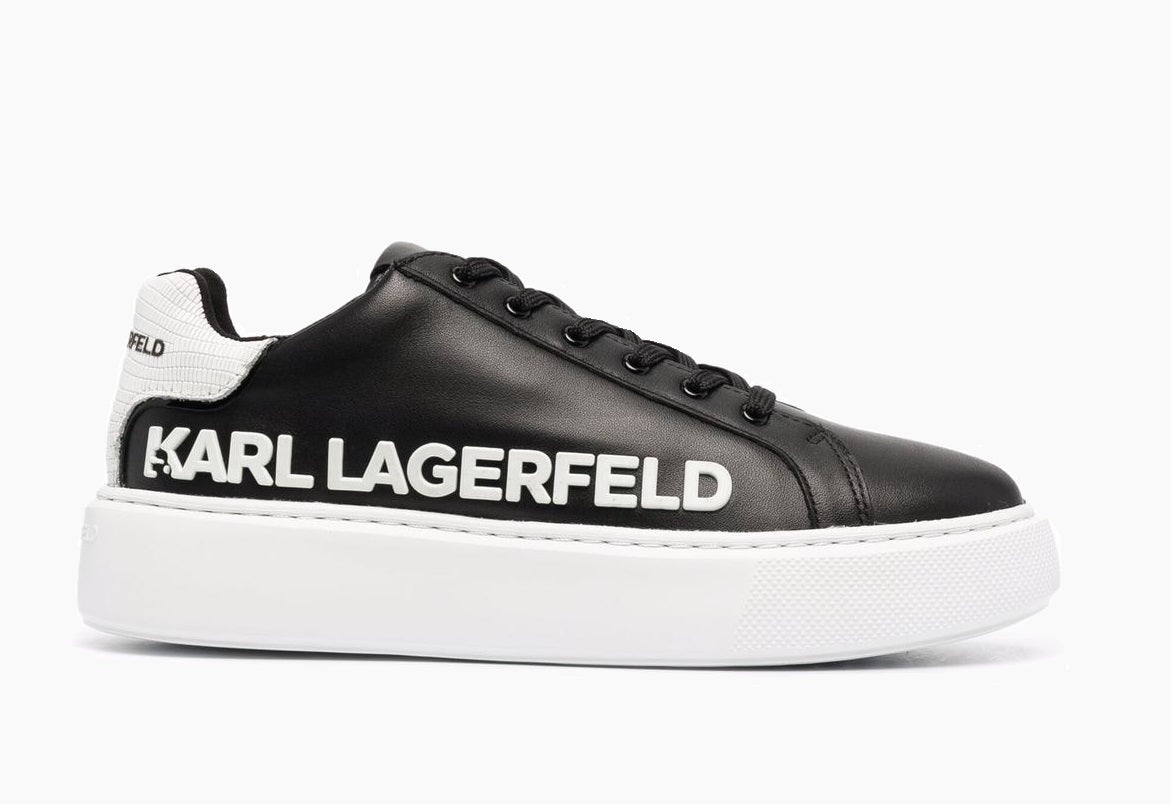 Black/white leather Maxi Kup logo-print sneakers from KARL LAGERFELD featuring logo print to the side, branded heel counter, round toe, front lace-up fastening and flat rubber sole.