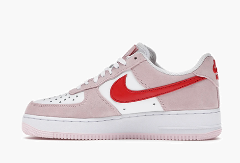 The Nike Air Force 1 Low “Valentine’s Day Love Letter” is a cheeky colorway of the popular low-top sneaker dedicated to the heartwarming holiday. A February 2021 release by Nike, the “Valentine’s Day Love Letter” functions as an ode to the Air Force 1. Beginning with a button design on the tongue that, when released, reveals “True Love Since ‘82” text on the right shoe and a heart graphic on the left shoe. A scarlet red colored leather Swoosh can be found on either side and light pink suede graces the toe cap, forefoot, eyelets, collar, and heel. The fuzzy detailing forms a striking contrast to the white leather base. Red embroidered “Nike Air” branding is stitched onto the heel. Underfoot, the white rubber midsole with “Air” branding on the heel is contrasted by a pink outsole. Release date: February 6, 2021.